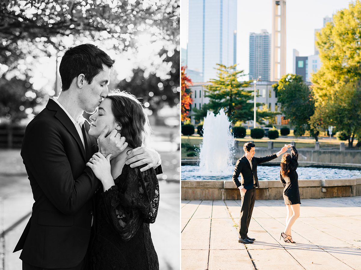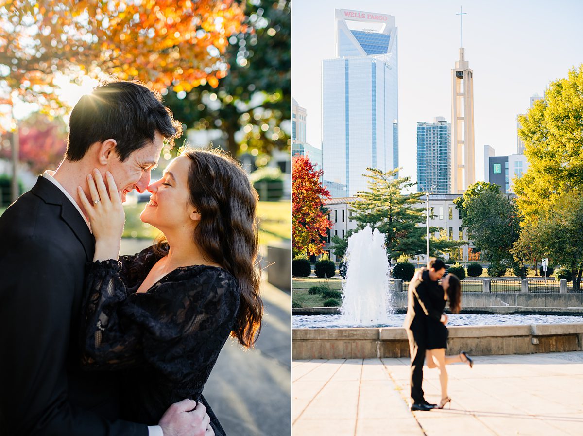 We started their session in Marshall Park, a hidden gem in Uptown Charlotte that offers an amazing vibe. Between the skyline peeking through the trees, the modern architecture, and the serene fountain area, it gave us the perfect mix of nature and city. Marshall Park has such a peaceful atmosphere, and it allowed us to slow down and capture those intimate, in-between moments that tell the real story of who Bailey and James are together. For couples wanting engagement photos in Uptown Charlotte, Marshall Park is a stunning option that’s romantic, quiet, and full of sleek city charm.