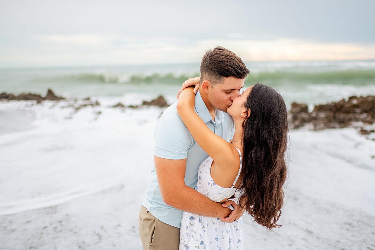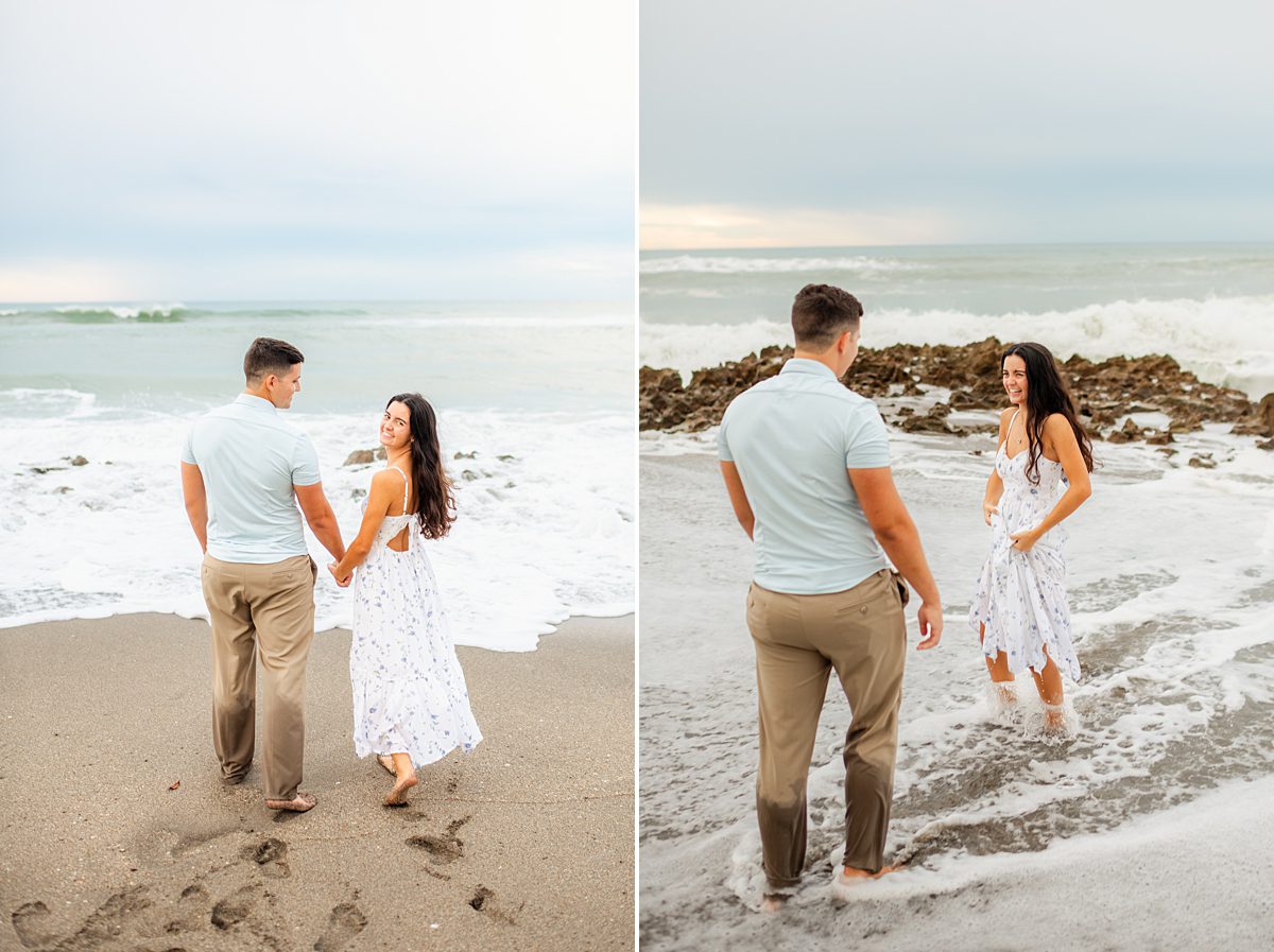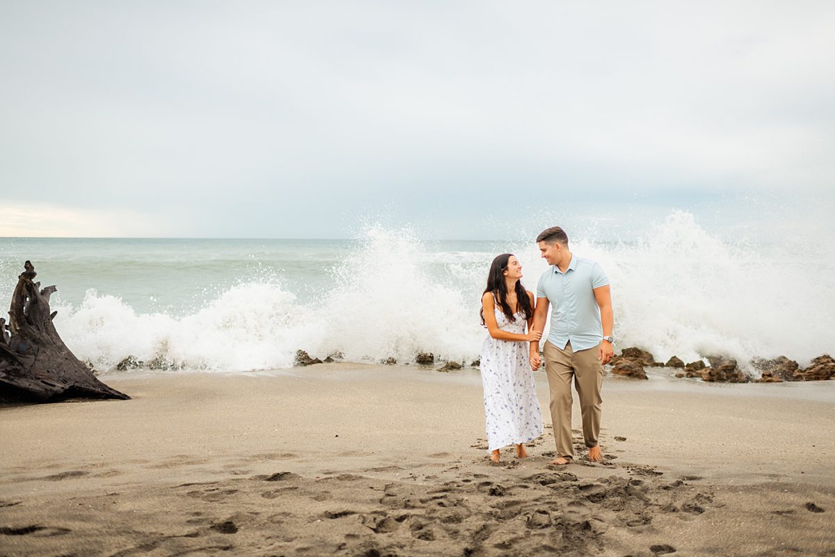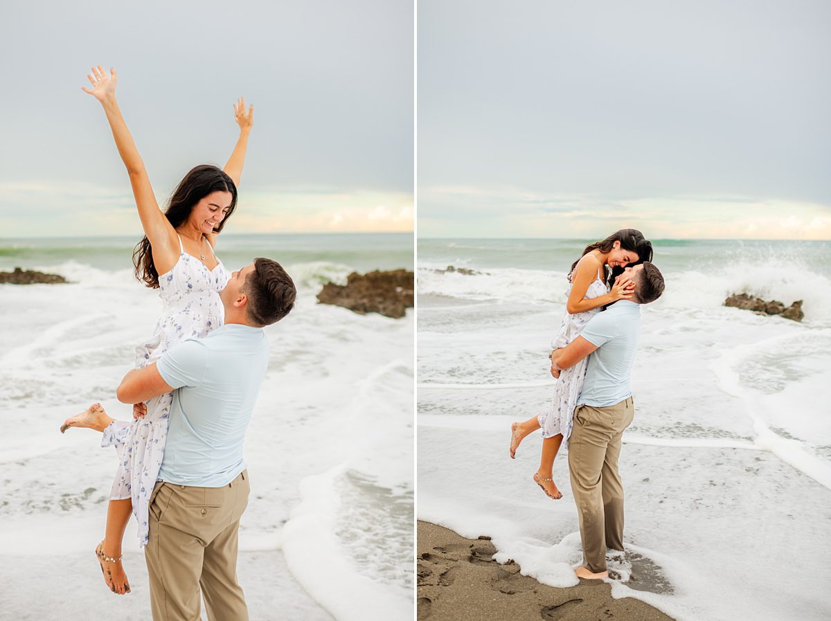 What we love about Jupiter beach engagement photos is how versatile they can be! You get the soft, romantic moments with toes in the sand and although it was cloudy that day, towards the end of the session, we found a pocket of golden light just as the sun was setting. You also can have spontaneous, joy-filled images with wind-blown hair, playful splashes, and the ocean putting on its own show in the background. This session had the best of both worlds!