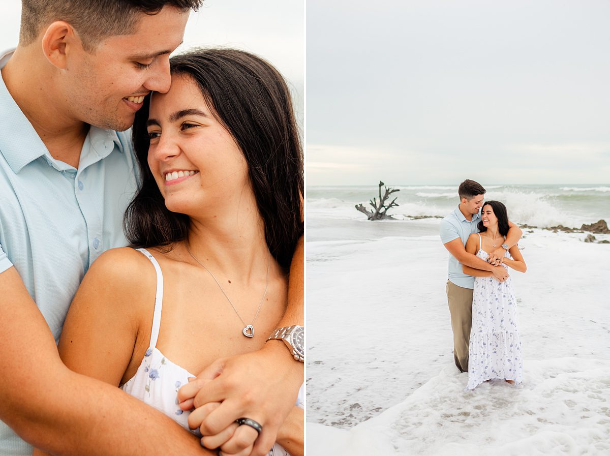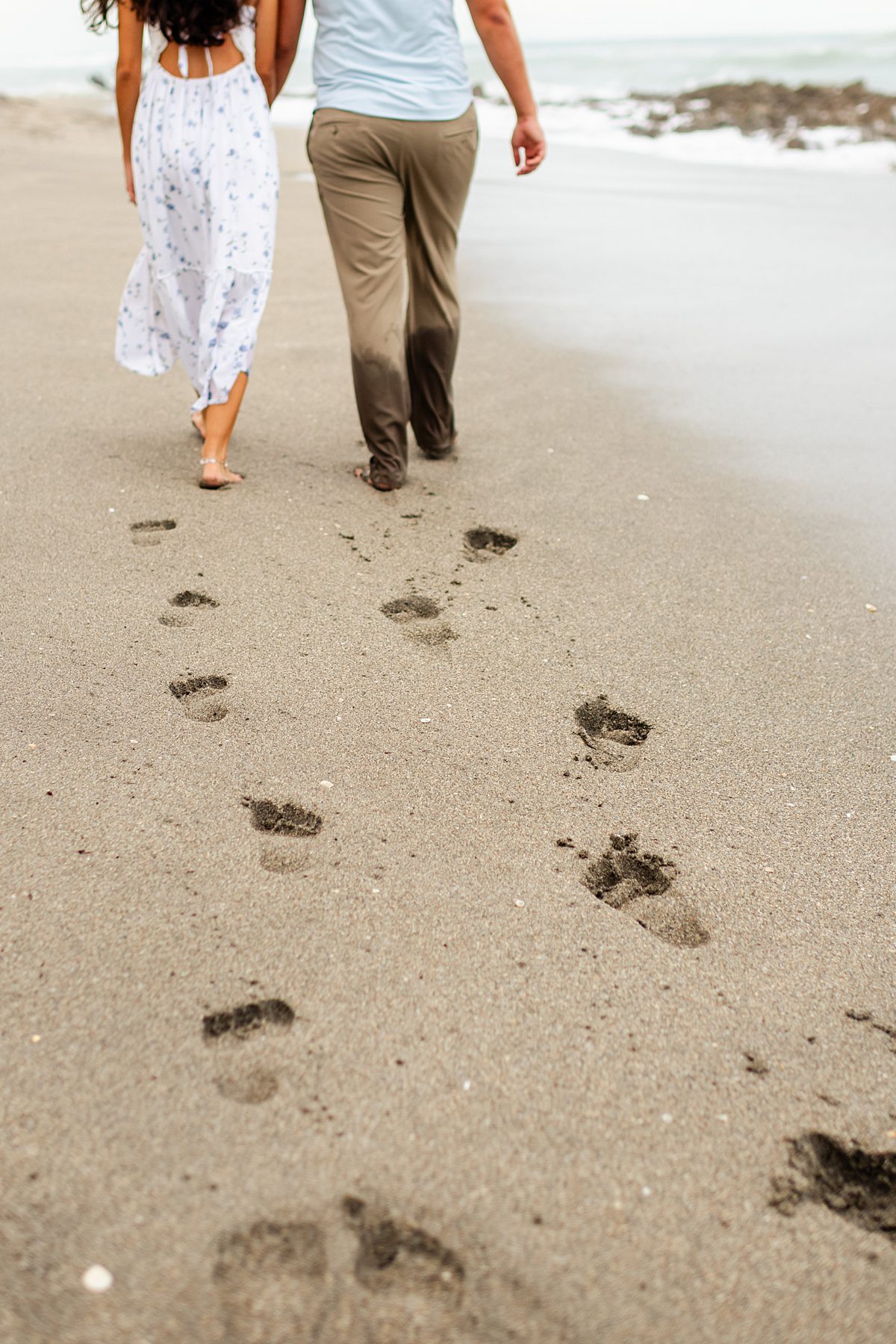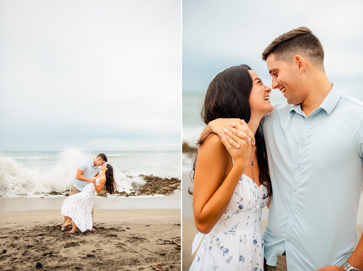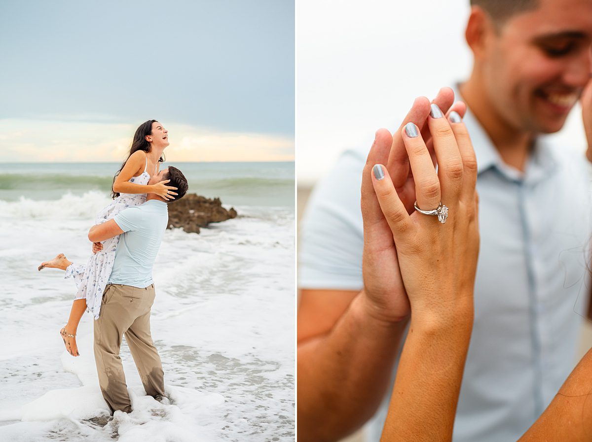 What we love about Jupiter beach engagement photos is how versatile they can be! You get the soft, romantic moments with toes in the sand and although it was cloudy that day, towards the end of the session, we found a pocket of golden light just as the sun was setting. You also can have spontaneous, joy-filled images with wind-blown hair, playful splashes, and the ocean putting on its own show in the background. This session had the best of both worlds!