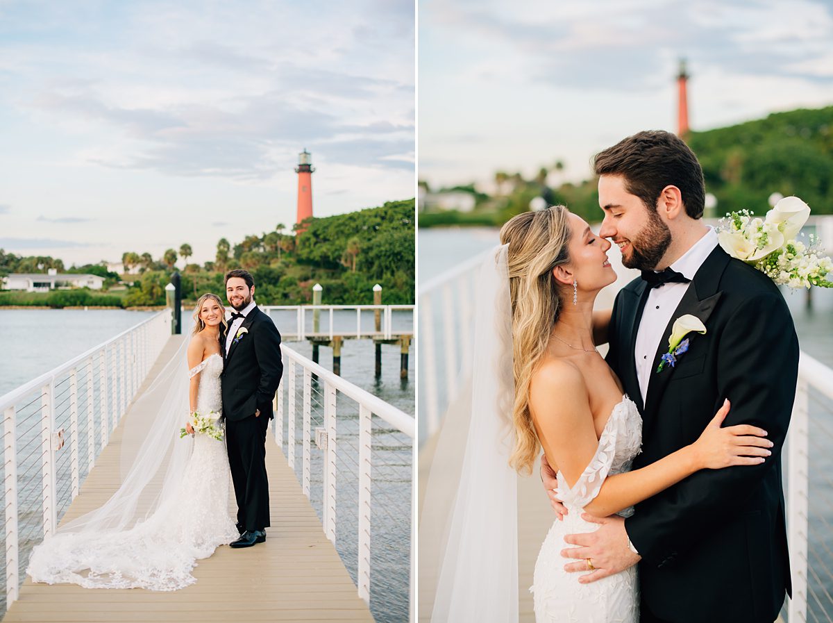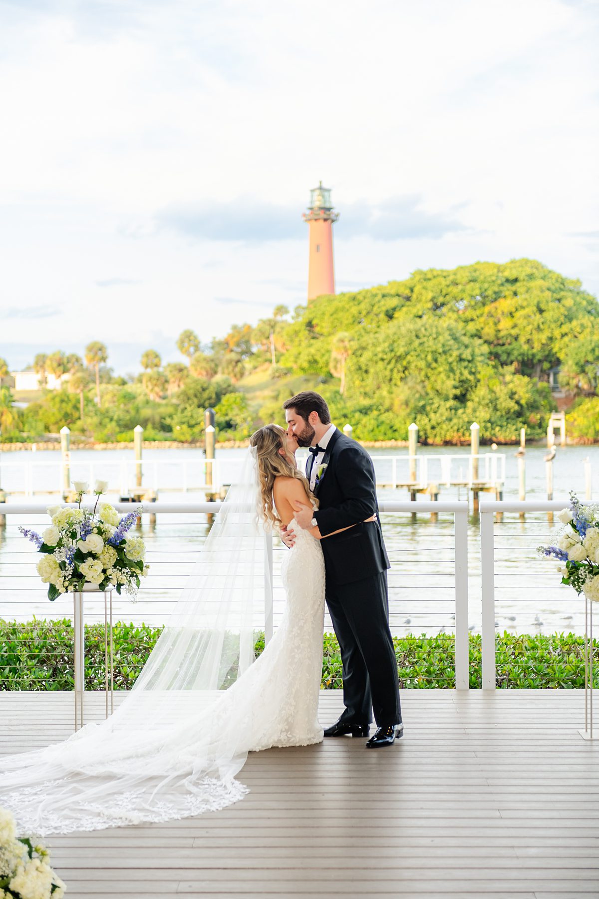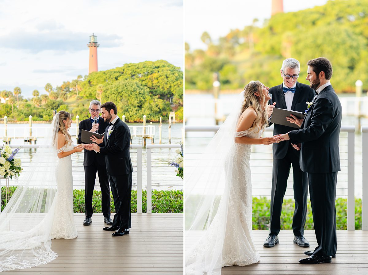 The morning was calm but excited, with happy nerves, sweet moments with family, and lots of genuine smiles. Alexa absolutely glowed, surrounded by people who clearly adore her. James’ reaction when he saw her for the first time during their first look? Pure joy! These are the moments we live for in the in-between glances, the quiet excitement, the deep breaths before the day unfolds. Their ceremony took place overlooking the water, with the iconic Jupiter lighthouse serving as the perfect backdrop. There was so much laughter woven into the ceremony including happy tears, beaming smiles, and that unmistakable feeling of this is exactly where we’re meant to be. The love between Alexa and James was effortless and evident in every moment!